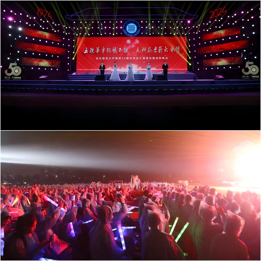 9月11日晚,学校在滨湖校区第二运动场举办建校50周年专业汇报演出暨迎新晚会,2024级新生在现场或线上观看演出。演出分为筚路蓝缕历沧桑、沐风栉雨绽芳华、银舟通海举征帆三个篇章。形式多样、精彩纷呈的节目回顾了学校办学历史,展示了学校办学成就,表达了校友的祝贺之情和学校对校友、2024级新生的欢迎之意,描绘了淮师大人对未来的美好憧憬。