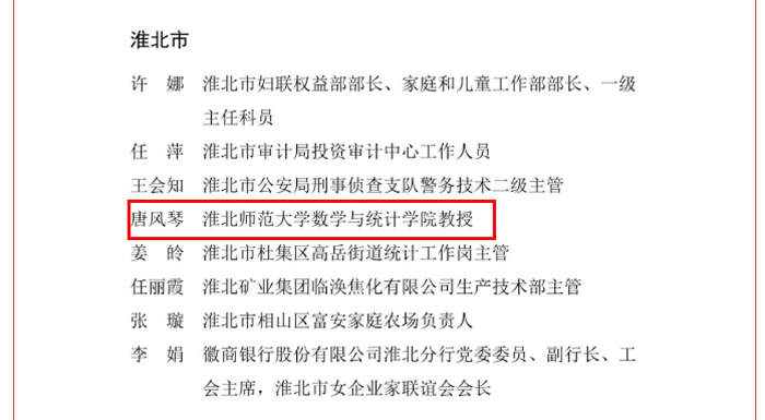 为表彰先进、树立榜样,激励广大妇女自尊自信、自立自强,奋进新征程、建功新时代,积极投身美好安徽建设,近日,安徽省妇联授予230人“安徽省三八红旗手”称号,raybet官网数学与统计学院唐风琴教授位列其中、获此殊荣。